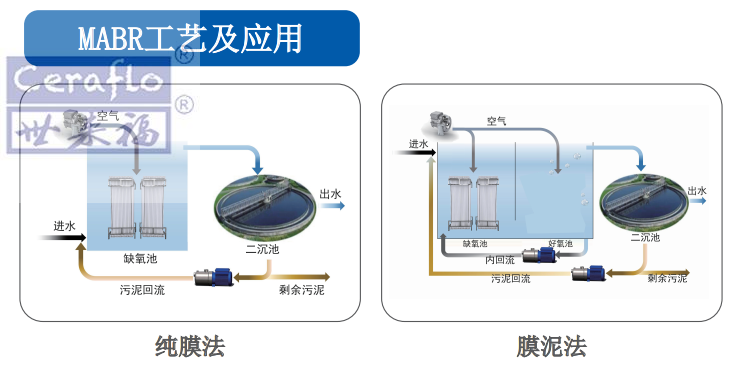 Ceraflo-MABR膜采用中空纖維膜結構,由自主專利技術及生產的微米級PTFE膜絲。讓膜絲內的空氣從微米級的孔隙向外滲透出去,讓水中的溶解氧得到更好的提升且能耗更低。對生物膜的分布以及碳源的利用有著更好的提升效果,大部分的好氧缺氧微生物會富集在膜絲內側。該生物膜反應單元組成的MABR,能夠高效處理污水,可減小反應池的大小,降低建造處理成本和減少用地。